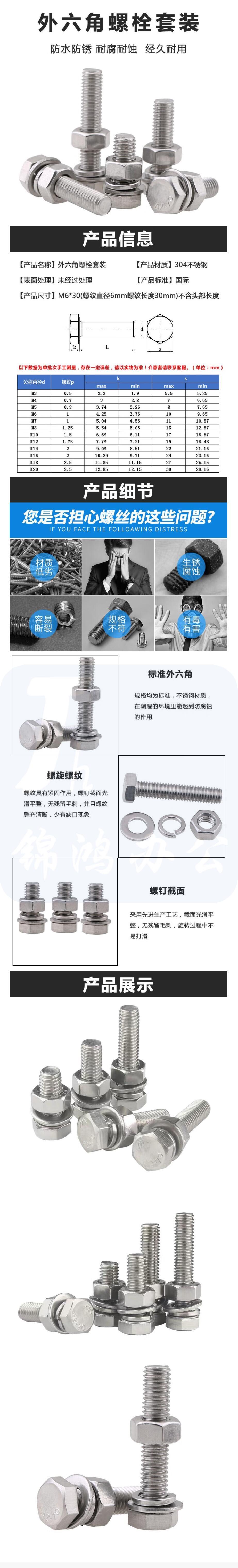 不锈钢外六角螺栓螺丝 M10/60mm 一母两垫 螺栓弹簧平垫套装