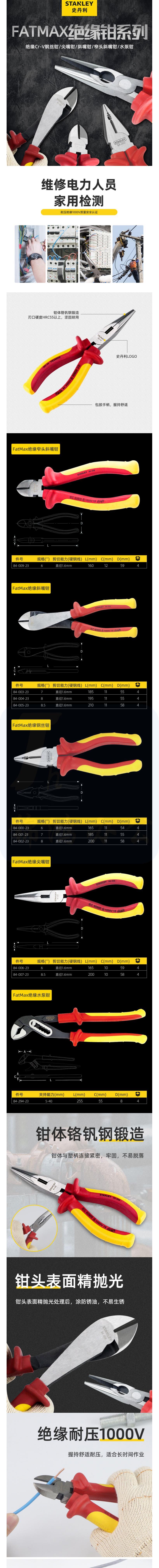 史丹利(STANLEY)FatMax系列绝缘钢丝钳 老虎钳 电工钳6.5英寸84-000-23货号:JC