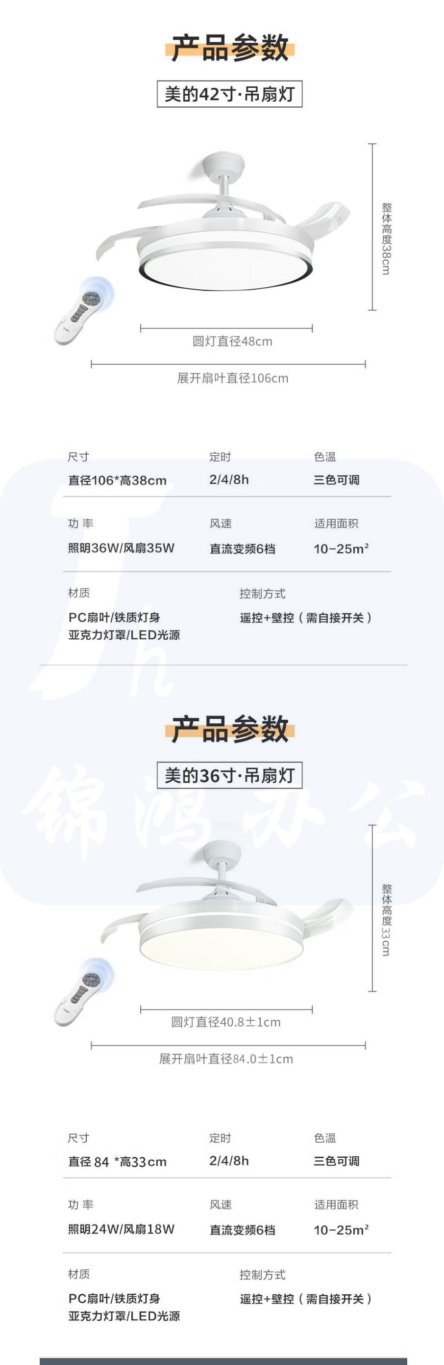 美的(Midea) 吊扇灯 餐厅隐形风扇 电扇灯遥控大风量LED风扇吊灯 FC105EERL 42寸遥控+三档调光+6档风速