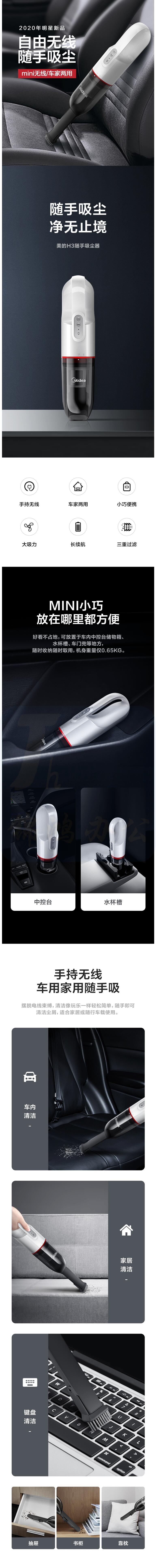 美的(Midea)无线手持车载吸尘器H3 车家两用小型大吸力大功率便携外带宠物家庭适用