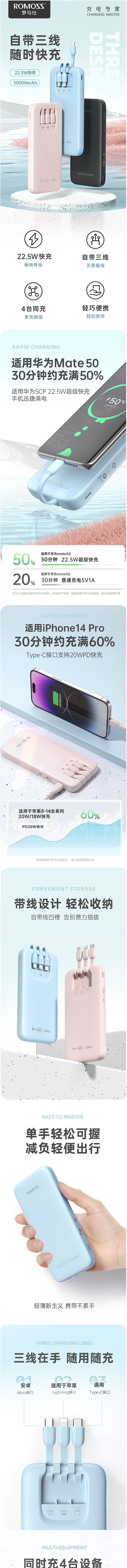 罗马仕 充电宝10000毫安时自带三线22.5W超级快充