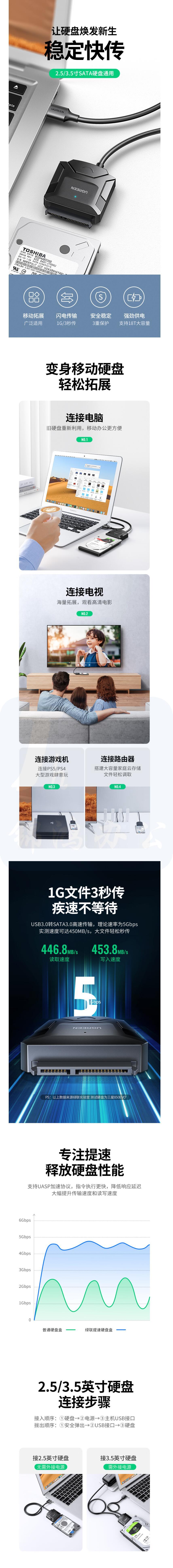绿联 USB3.0转SATA转换器 2.5/3.5英寸硬盘转接头 0.5米 20231