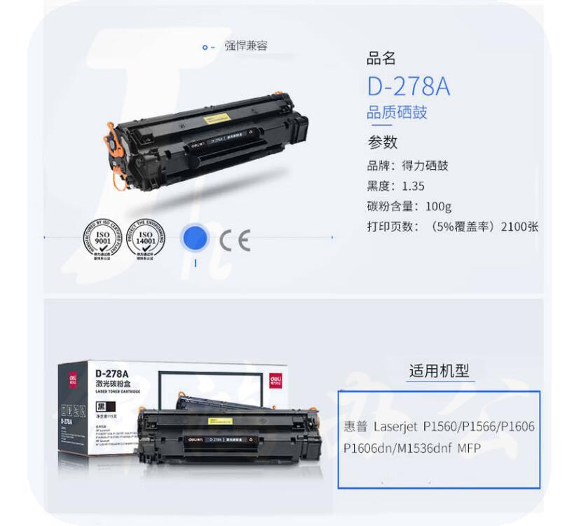 得力 D-278A 硒鼓黑色 适用适用惠普P1560 P1566 P1606 P1606dn D-278A