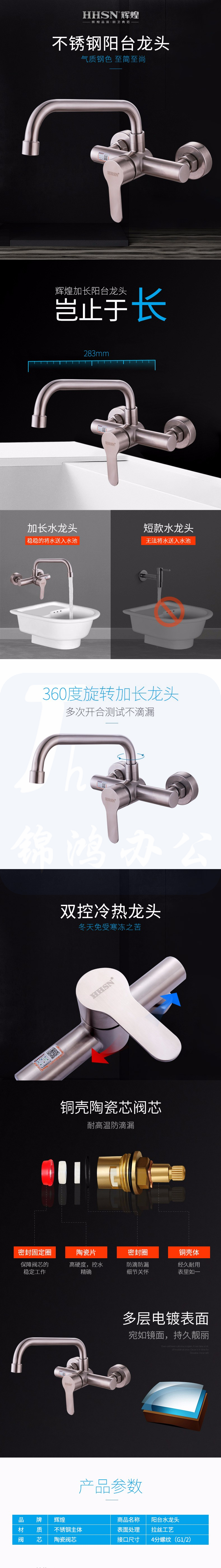 辉煌304不锈钢厨房龙头挂墙式阳台龙头单把双孔双控冷热龙头