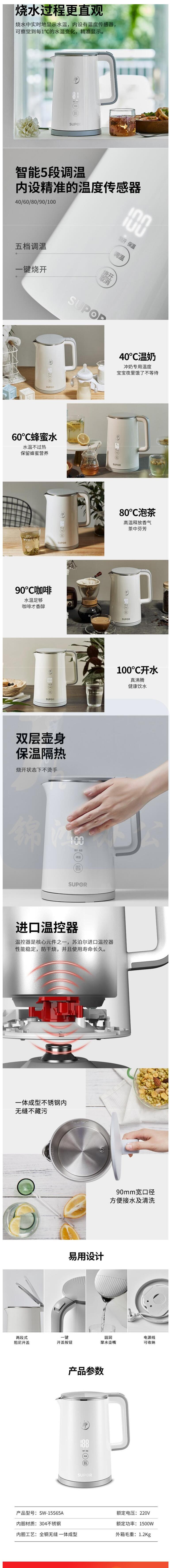 苏泊尔(SUPOR)电热水壶 双层防烫304不锈钢内胆水壶 家用大容量触控调温开水壶 1.5L SW-15S65A