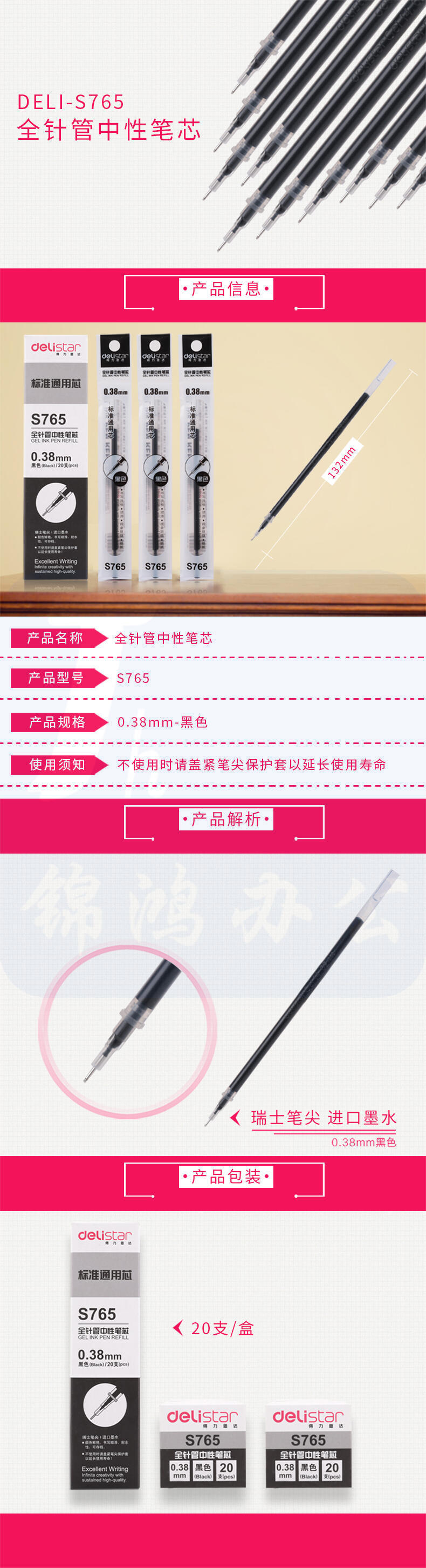 得力S765中性笔芯0.38mm全针管(黑)(20支)