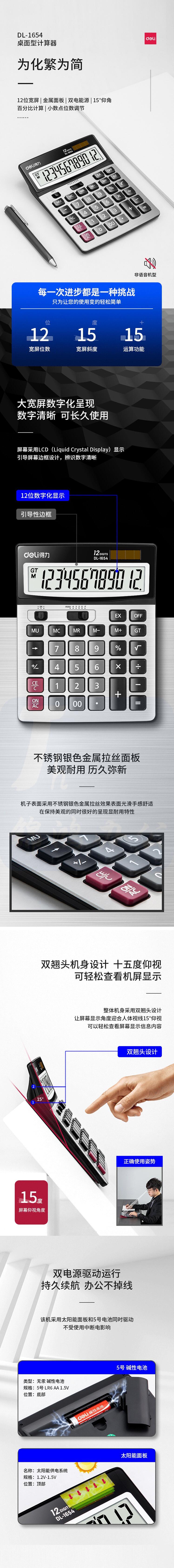 得力1654 双电源宽屏大号金属面板办公桌面计算器 金融财务计算机