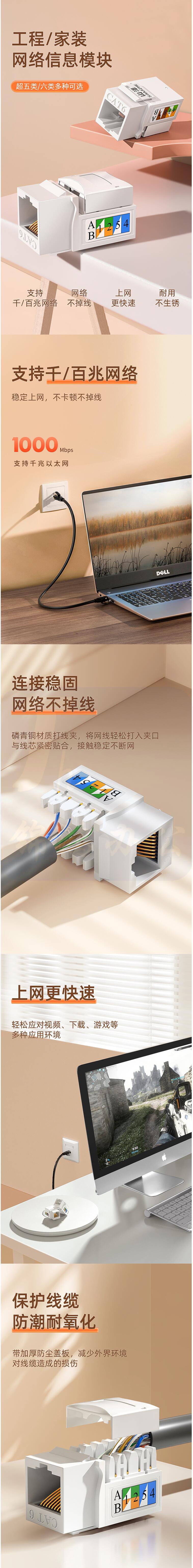 山泽(SAMZHE)WAN-06 六类网络模块 CAT6千兆网线插座面板模块 RJ45水晶头母座电脑网线镀金连接头 五个装