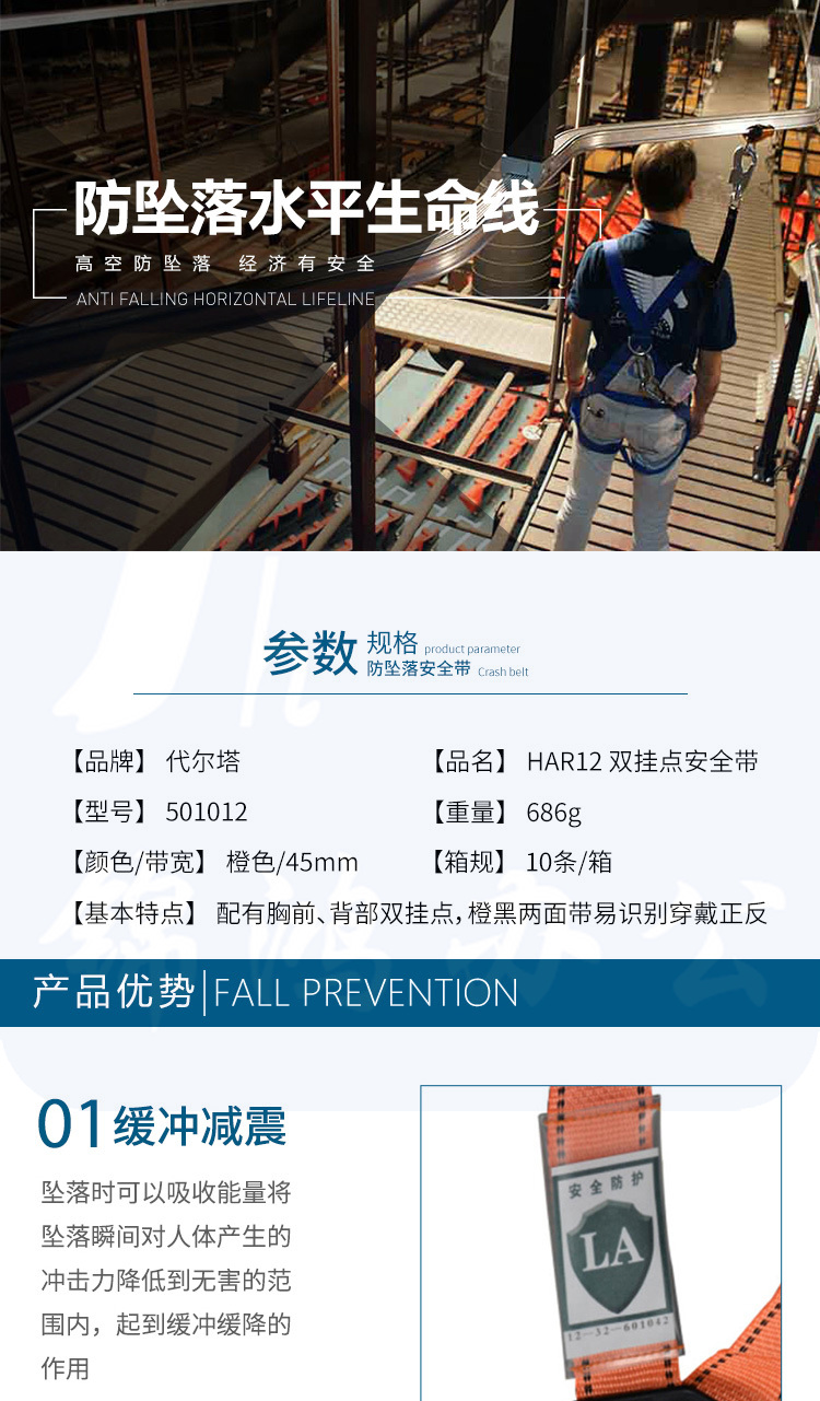 代尔塔 501012 双挂点安全带 高空坠落户外攀爬救援安全带