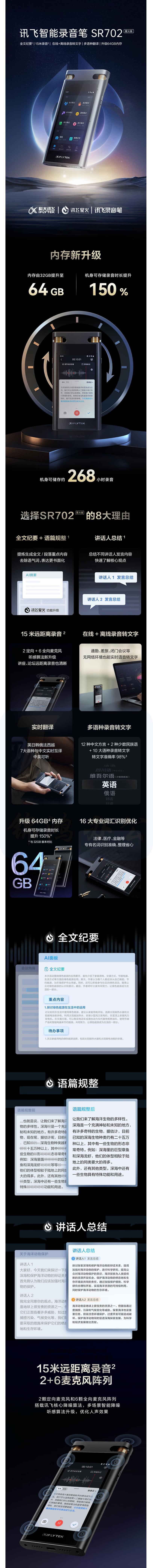 科大讯飞 智能录音笔SR702星火版 64G+20G云储存 星空灰 货号:WY
