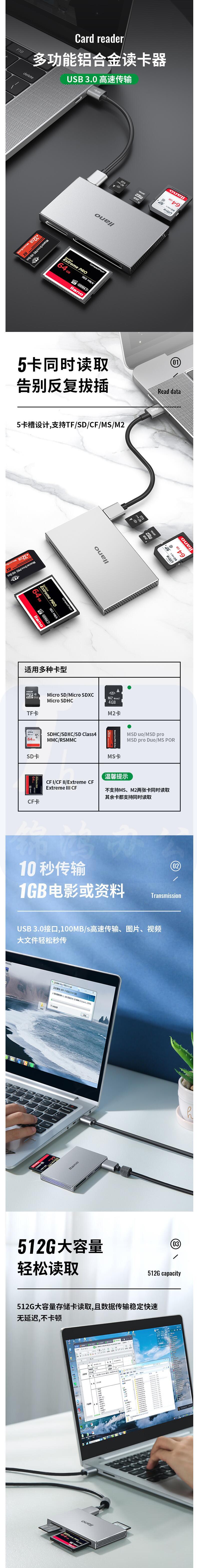 绿巨能 USB3.0读卡器 多功能五合一高速读卡 支持SD/TF/CF/MS/M2存储卡 CC1016