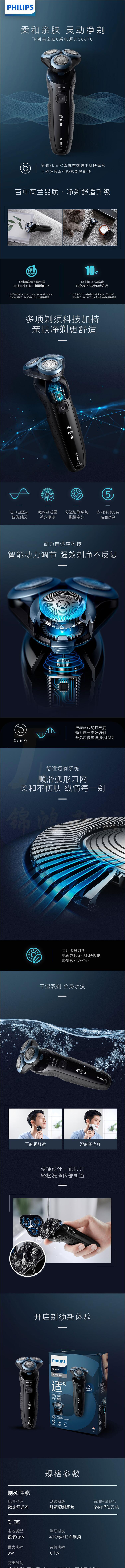 飞利浦(PHILIPS)电动剃须刀干湿双剃智能动力调节亲肤6系S6670【痘痘肌专属】