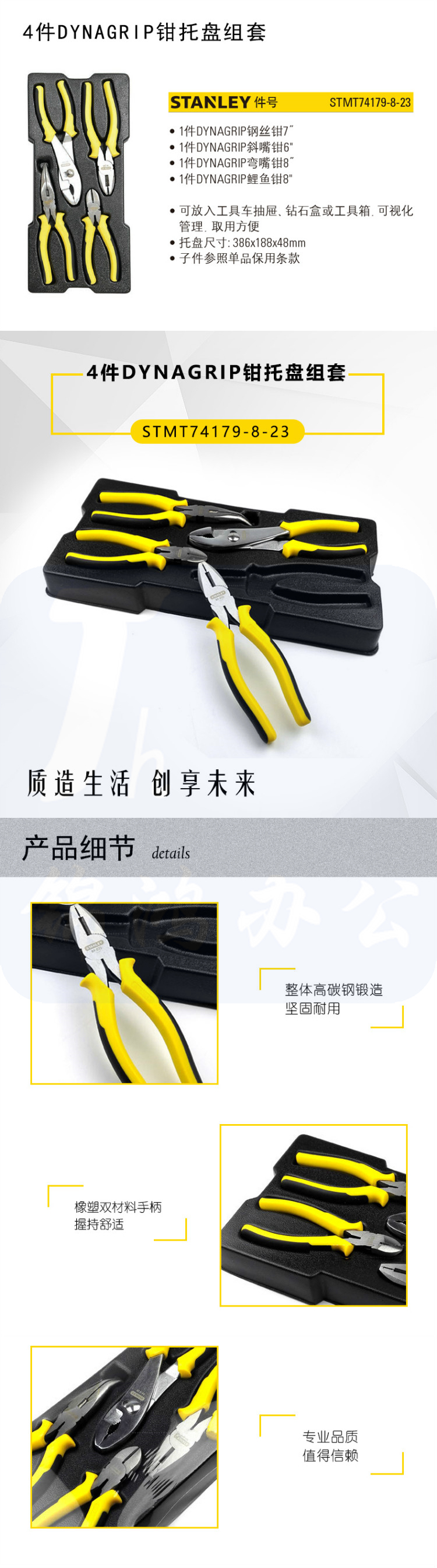 史丹利(STANLEY)4件DYNAGRIP钳托盘组套 钢丝钳 斜嘴钳 弯嘴钳 鲤鱼钳套装 STMT74179-8-23