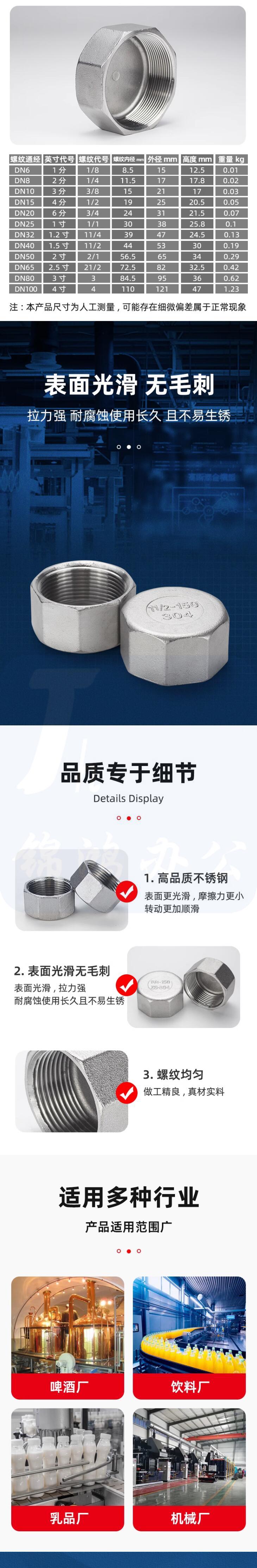 不锈钢六角管帽 内螺纹封头闷盖管堵头 DN20 货号:JC