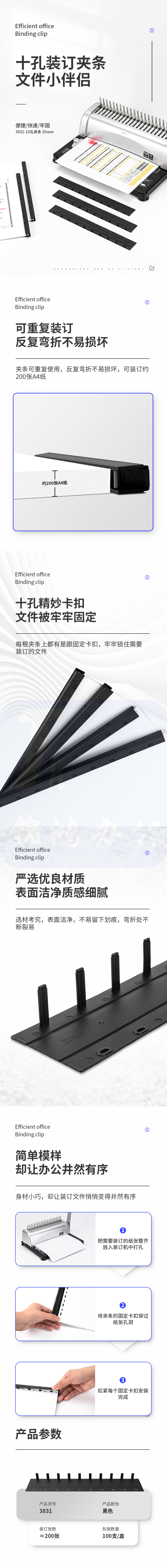 得力3831-10孔装订夹条(黑)300*20mm(100支/盒)(约装订200张)