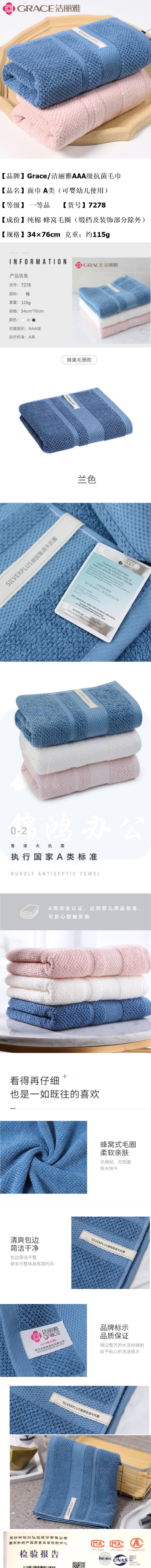洁丽雅毛巾 76*34cm 棉抗菌蜂窝鲁道夫毛巾115g 7278