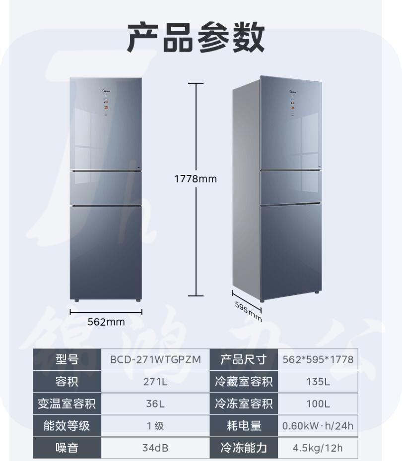 美的 271升三门冰箱 BCD-271WTGPZM 沁玉蓝