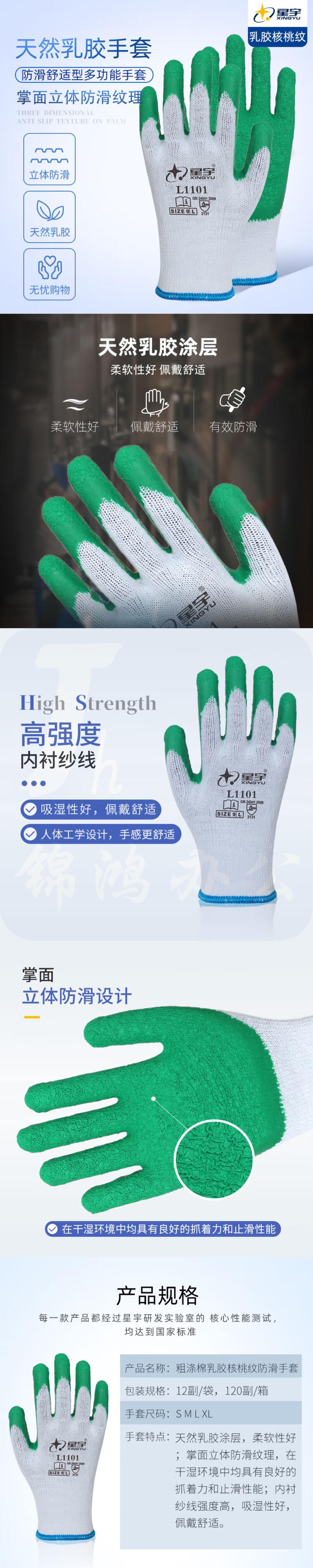星宇L1101 纱线乳胶皱纹防滑手套 劳保手套12付/包