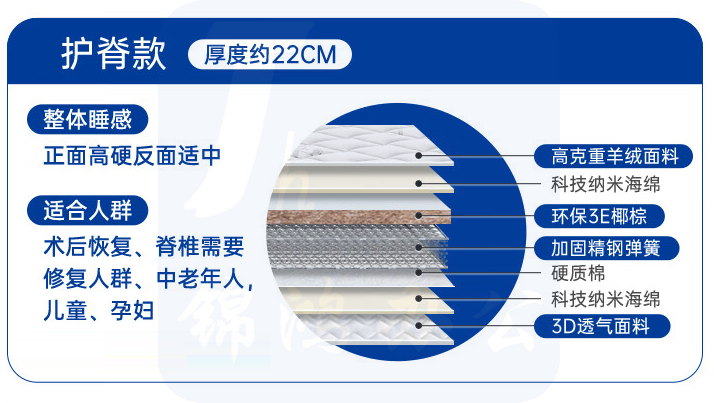 席梦思床垫 独立弹簧椰棕垫 (3E椰棕 精钢 羊绒面料) 厚度22cm 尺寸 1200mm*2000mm