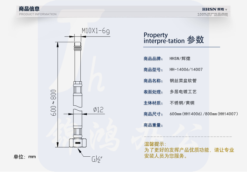 辉煌 (HHSN) 卫浴配件厨房菜盆面盆浴室不锈钢编织进水软管铜接口 HH14000-JS 长度600mm