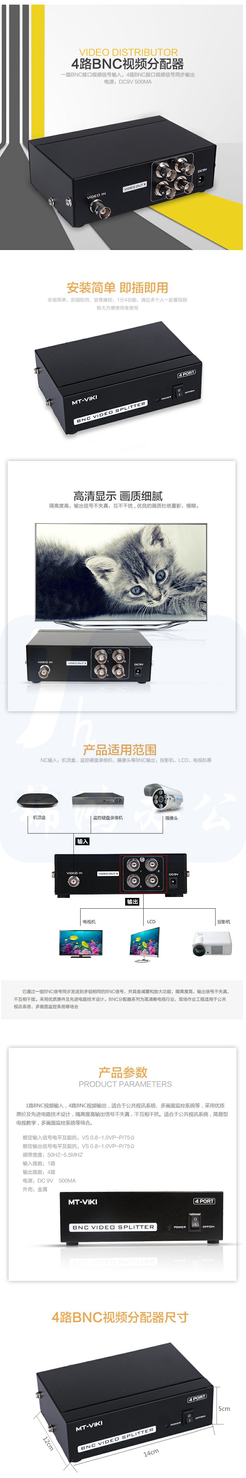 迈拓维矩 MT-104BC 4口 BNC分配器 1进4出 视频一分四监控 清晰