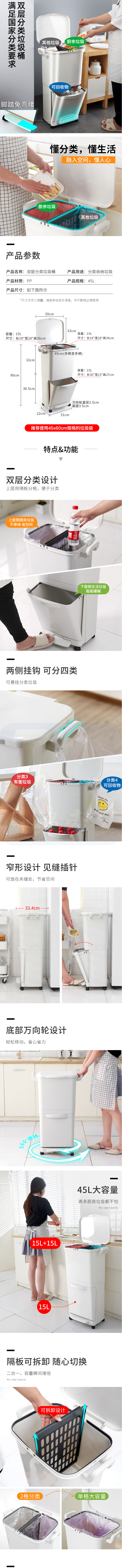 佳佰 45L垃圾桶 分类垃圾桶干湿分离塑料桶双层厨房带盖带滑轮可移动
