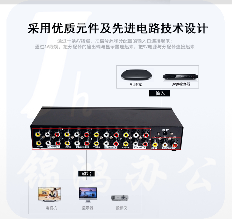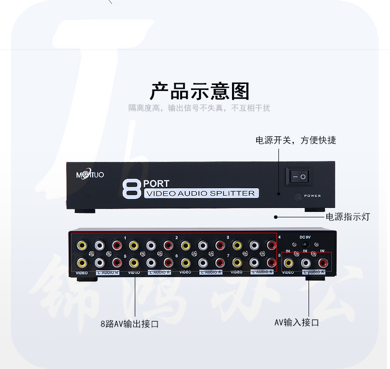 迈拓维矩MT-108AV av分配器1进8出rca分配器一分八音视频信号分配器