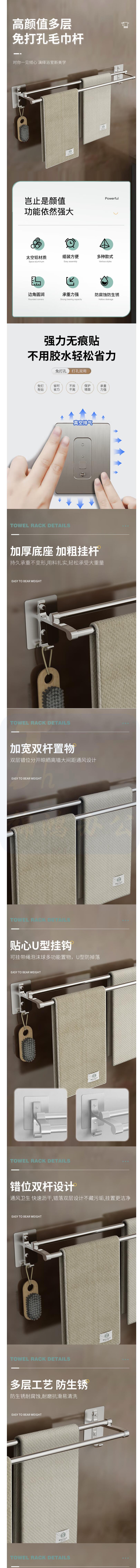 毛巾架 免打孔双杆卫生间浴室挂架浴巾架子 银色60cm 货号:JC
