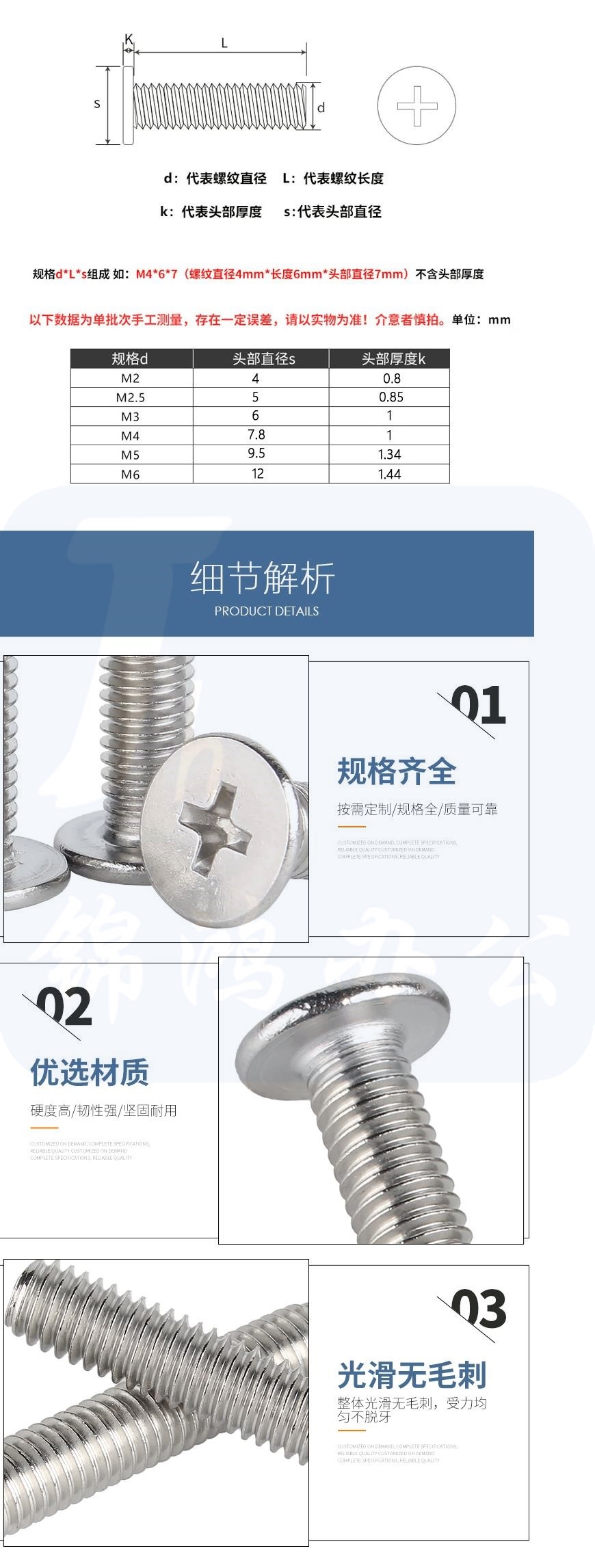 平头螺丝钉 十字螺丝钉 M6*12 100个 货号:JC