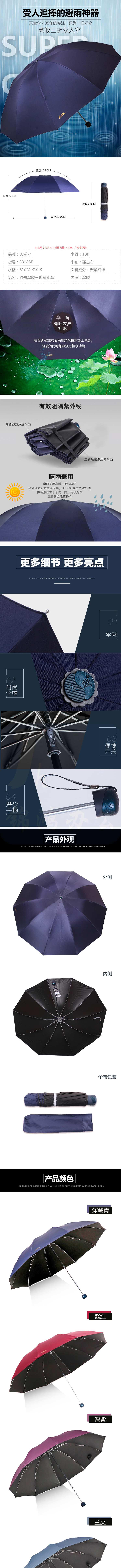 天堂伞 三折 61cmX10骨黑胶晴雨伞 藏青