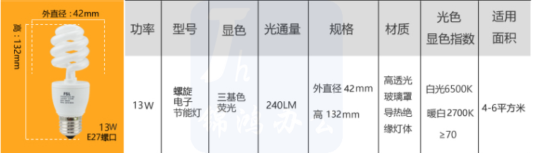 佛山照明 13W 螺旋节能灯 日光灯节能灯E27螺口荧光灯 6500K 白光