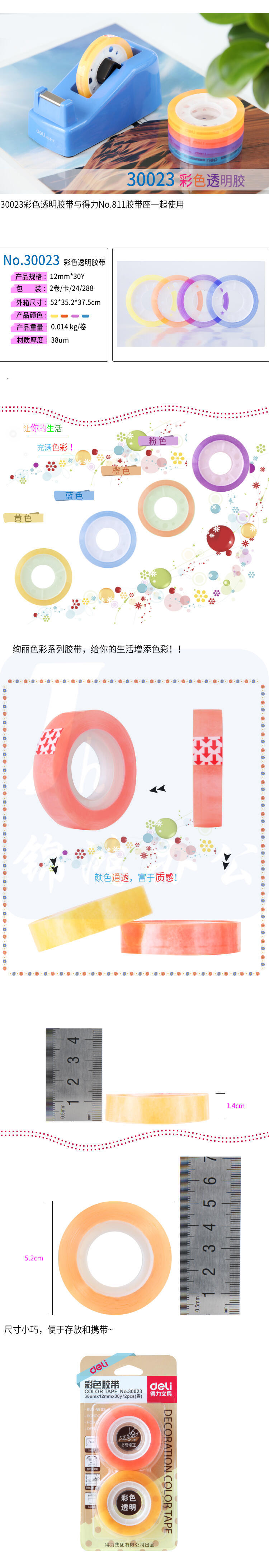 得力30023彩色文具胶带12mm*30y*38um(混)(2卷/卡)
