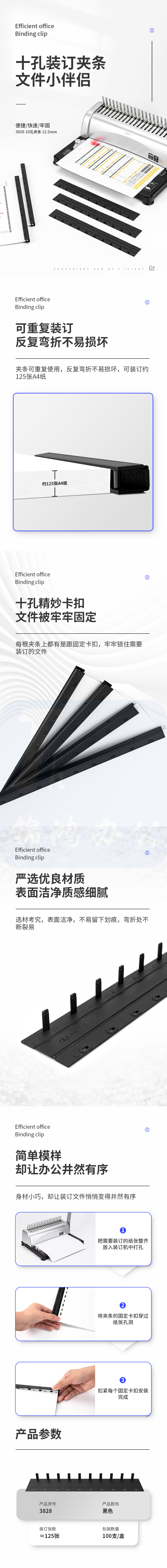 得力3828夹条装订夹条压条 装订耗材100根/盒 300*12.5mm(约装订125张)