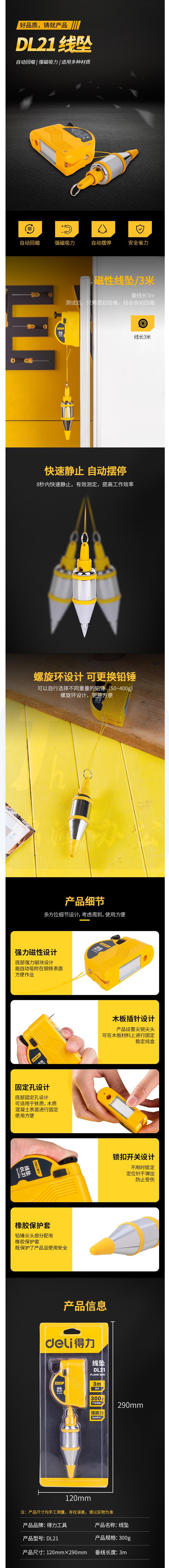 得力(deli) 3米 DL21 磁性线坠线锤磁力垂直锤装修吊线坠自动收线