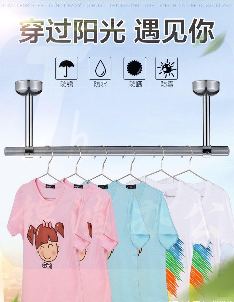 加厚304不锈钢阳台晾衣杆 固定式晾衣架单杆式晾衣杆顶装晒衣杆