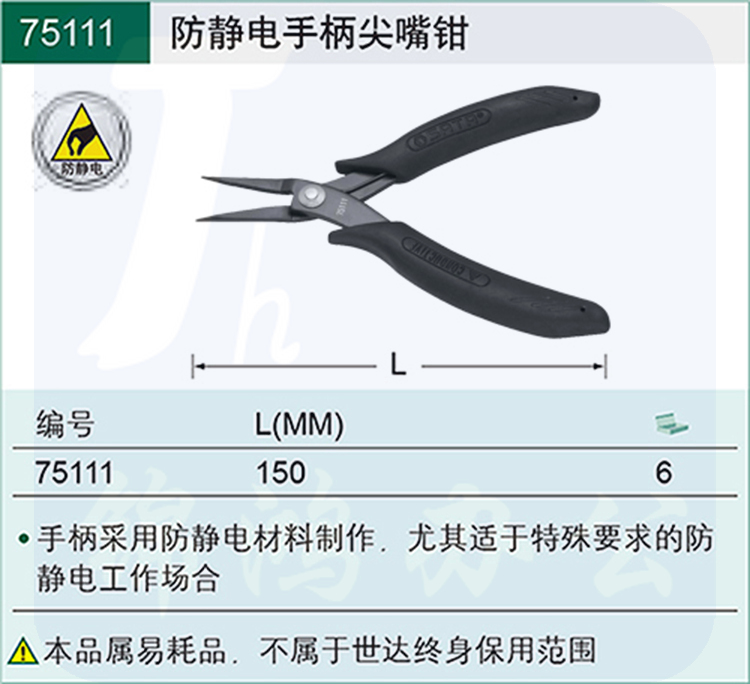 世达(SATA)防静电手柄尖嘴钳5"货号 75111