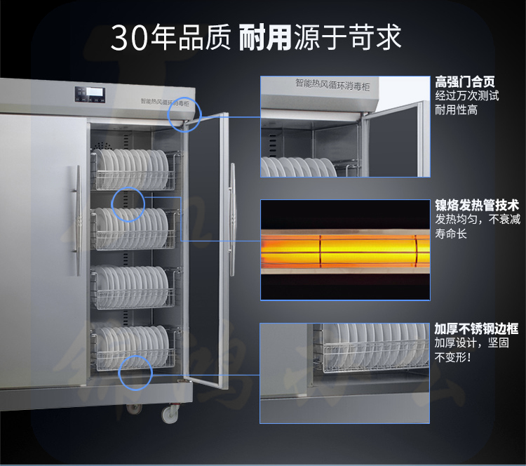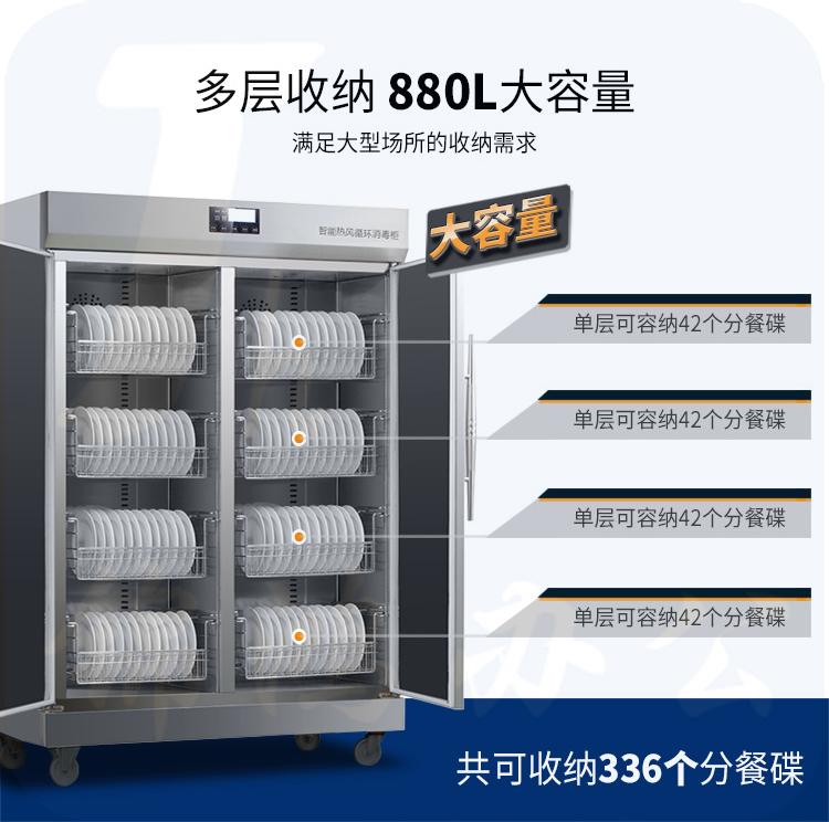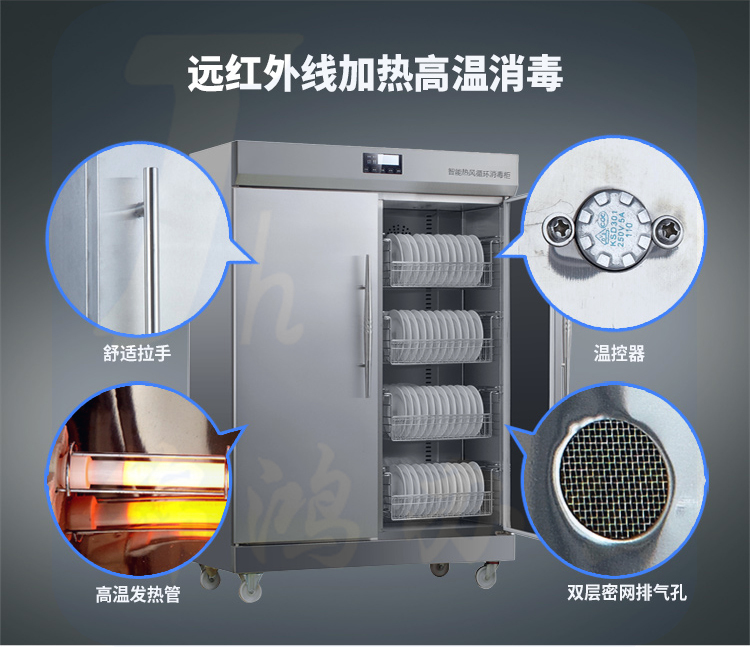 5、消毒方式及使用场所:热风循环高温消毒,使内部消毒温度更均匀,采用温控器和超温熔电器双重保护,安全可靠