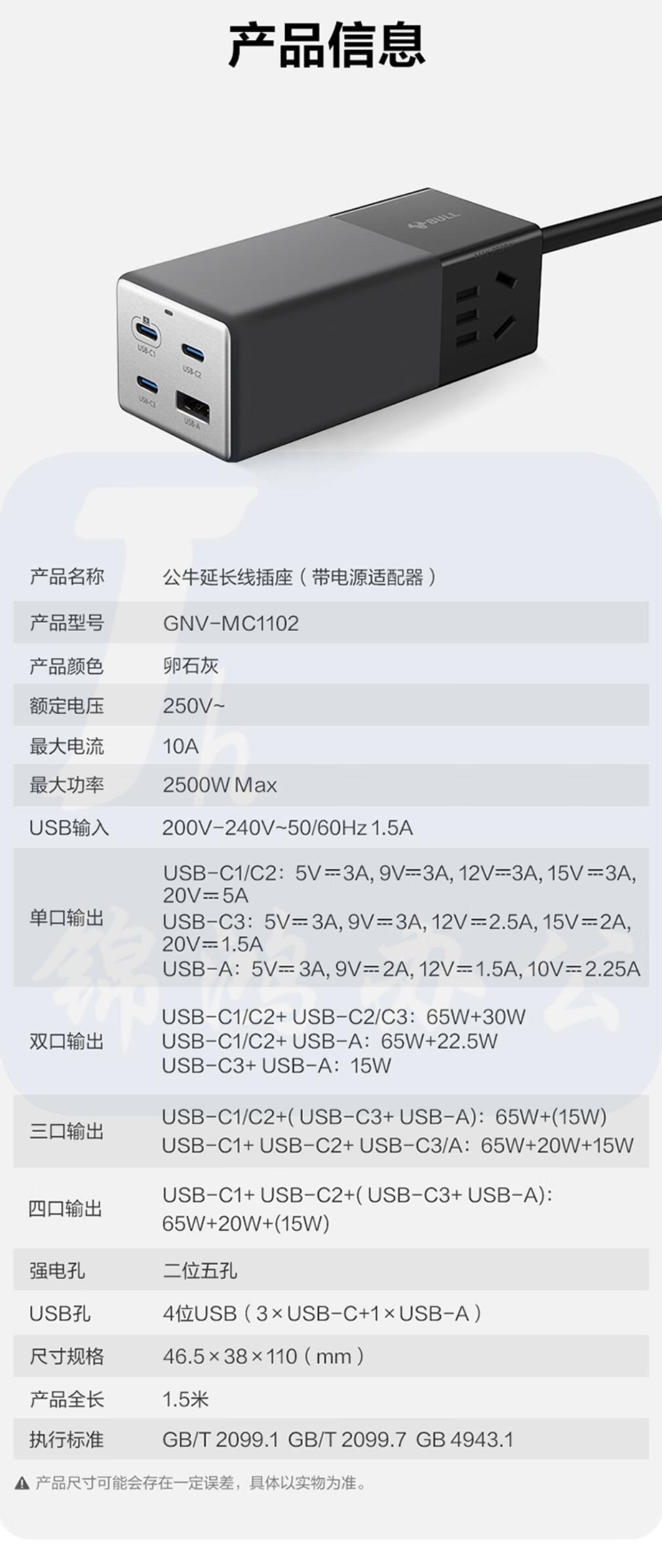 公牛 氮化镓100W充电器快充笔记本插座/插线板/插排/接线板 USB(3C1A)+2插孔 全长1.5米 GNV-MC1102