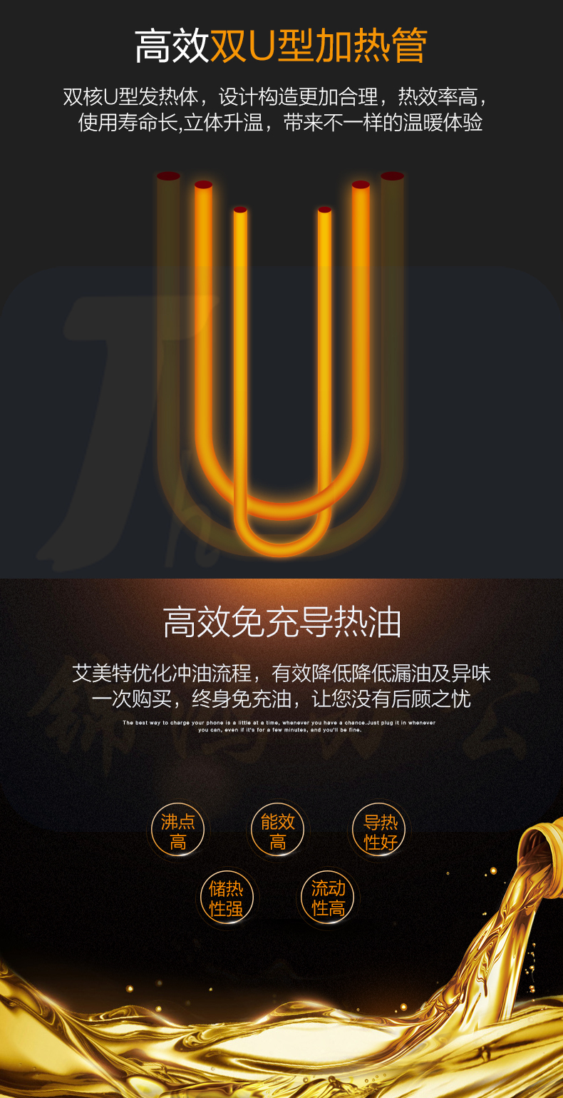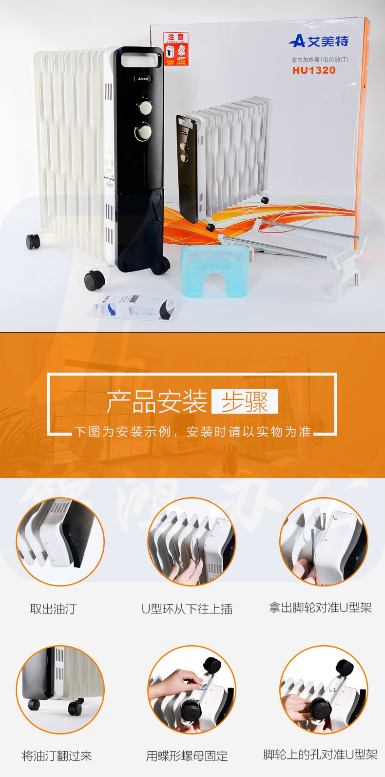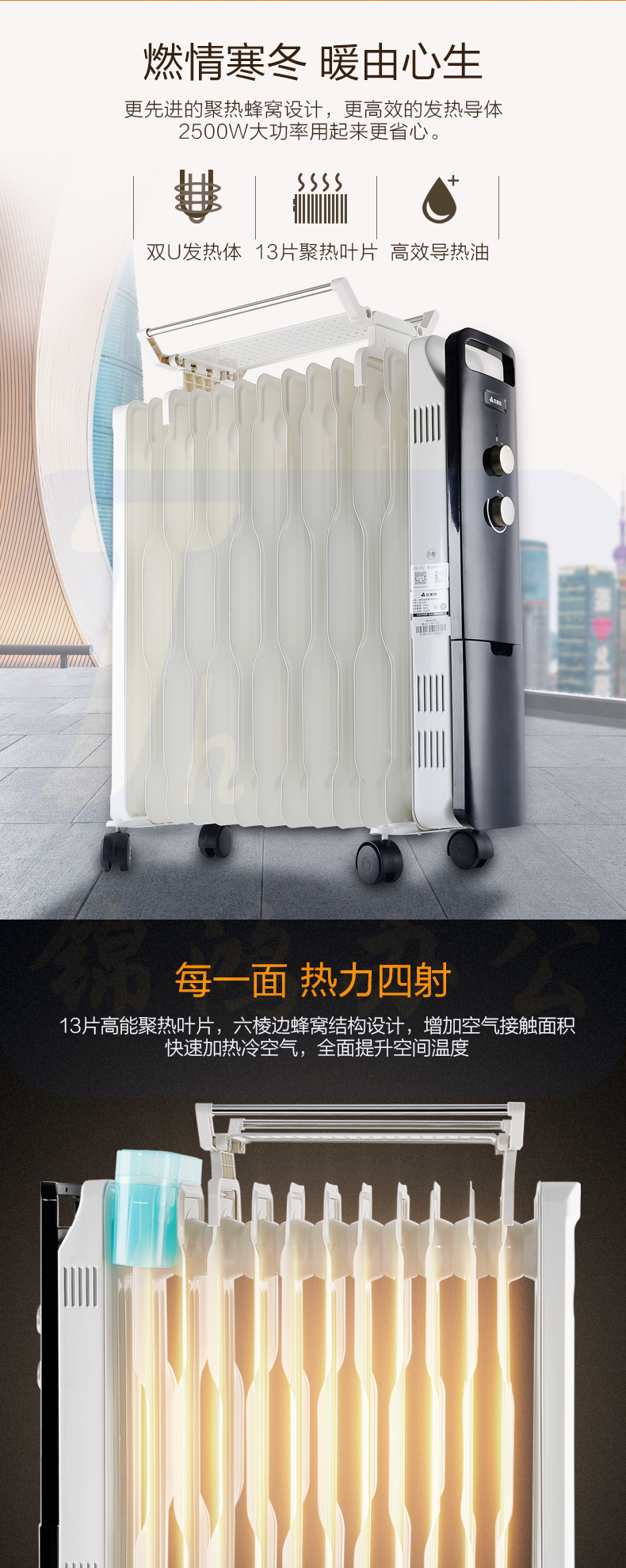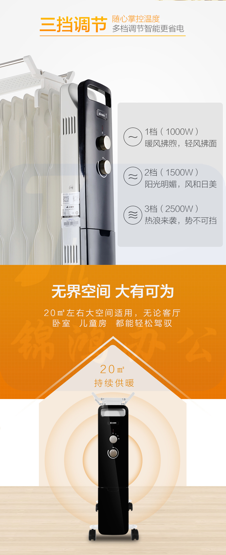 艾美特 13片 电暖气油汀取暖器 三档调温办公室节能省电取暖器 HU1320