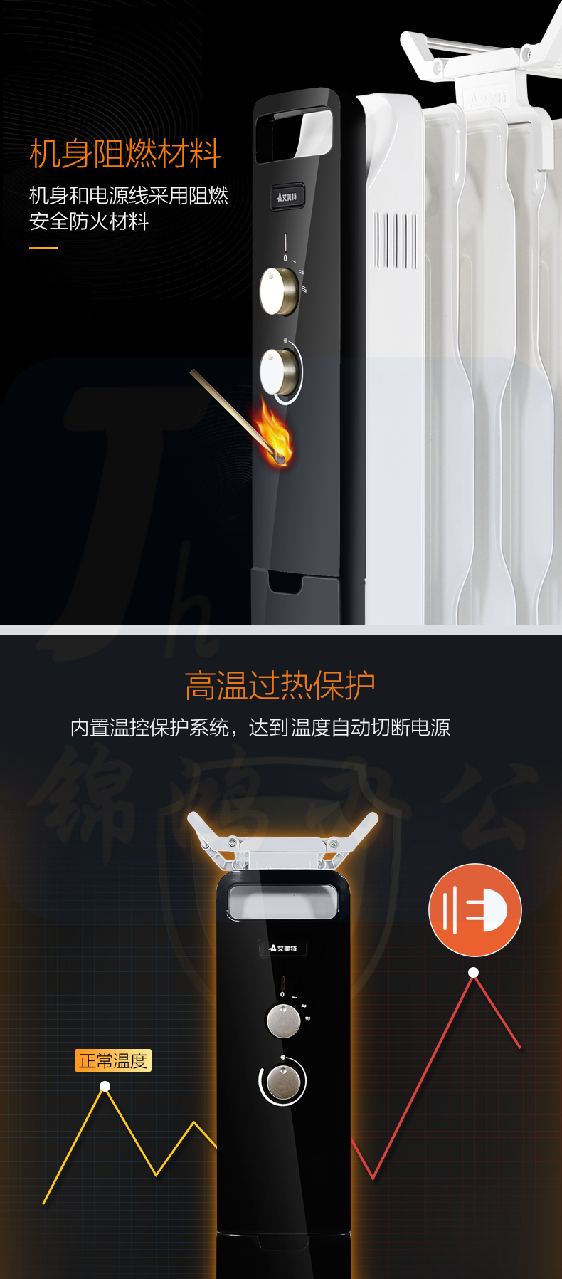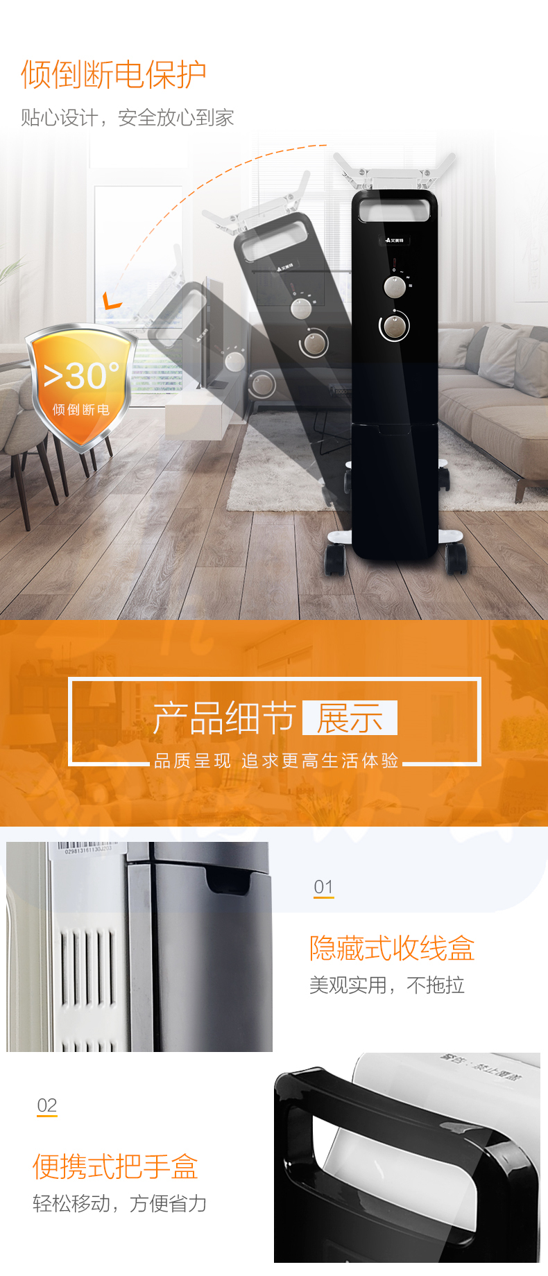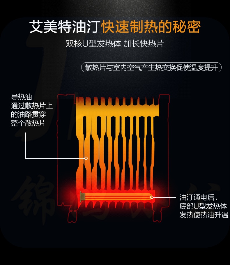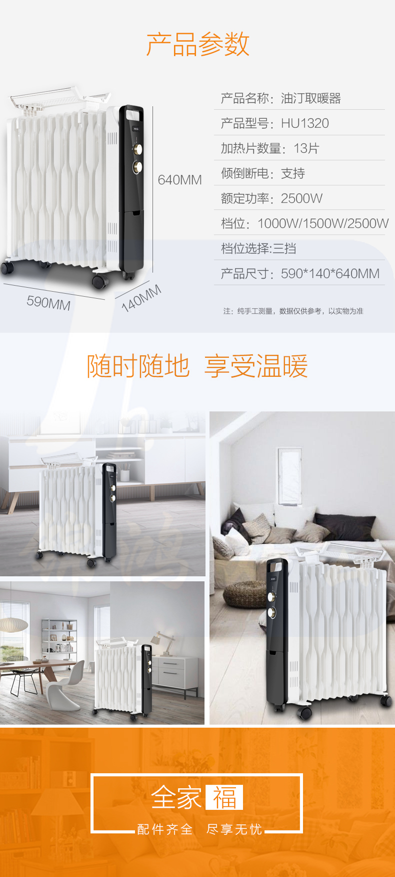艾美特 13片 电暖气油汀取暖器 三档调温办公室节能省电取暖器 HU1320