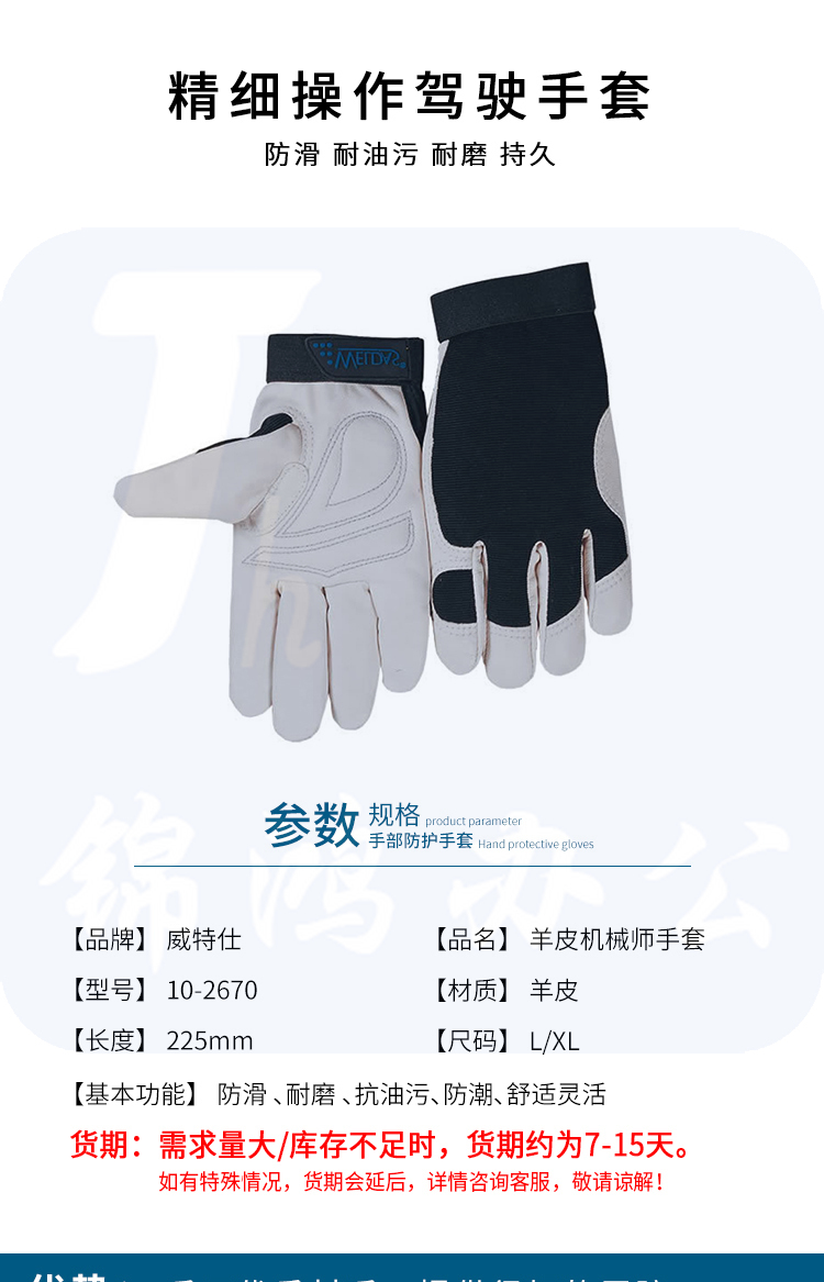 威特仕 10-2670 雄蜂王羊皮机械师手套有抗油防潮赛车手手套舒适灵活白色 1副