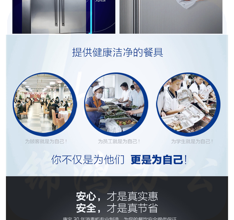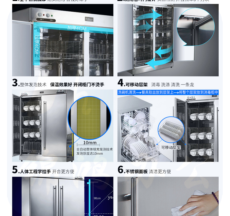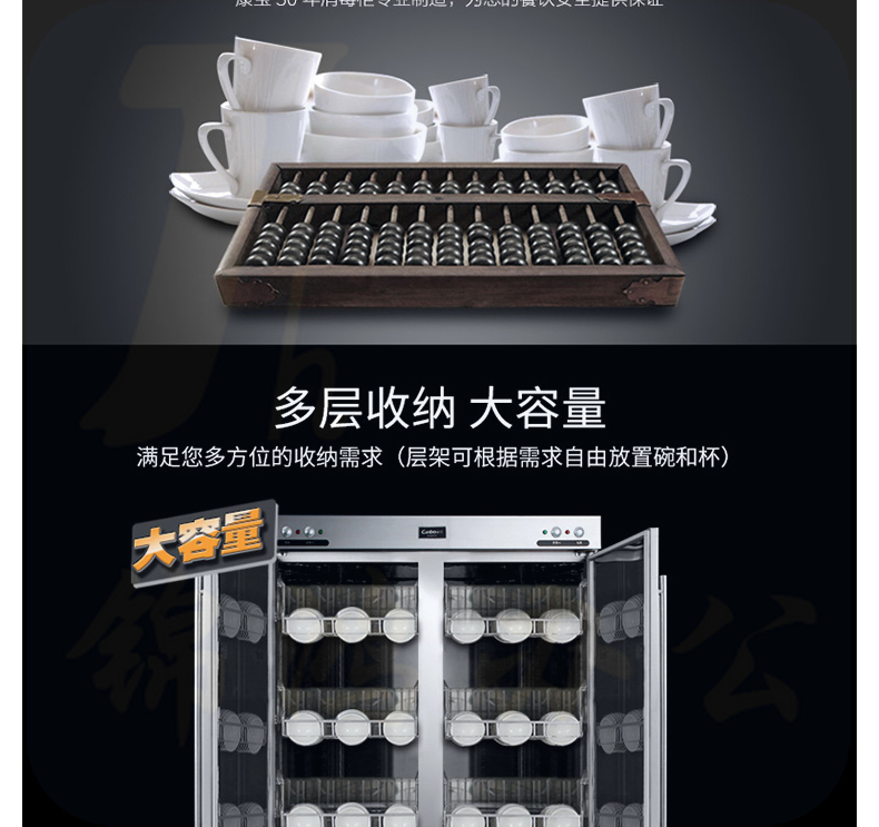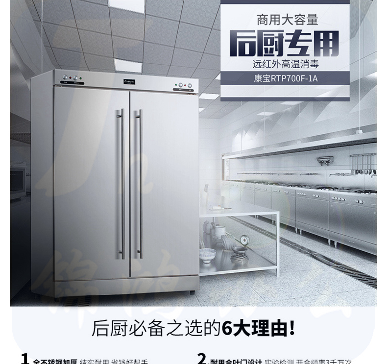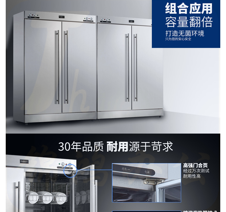 1、外形尺寸(mm):宽1192*深553*高1660 2、工作方式:高温 门材质:不锈钢 3、储存空间:双门双室 外壳材质:不锈钢 4、功率(W):220V~50Hz 1800W 容积(L):586L 5、消毒方式及使用场所:红外线高温消毒,主要用于耐高温的食具、茶具的消毒及存放适用于幼儿园、餐厅、 公共食堂、酒店等场所使用。