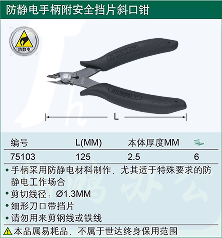 世达(SATA)防静电手柄附安全挡片斜口钳5"货号 75103