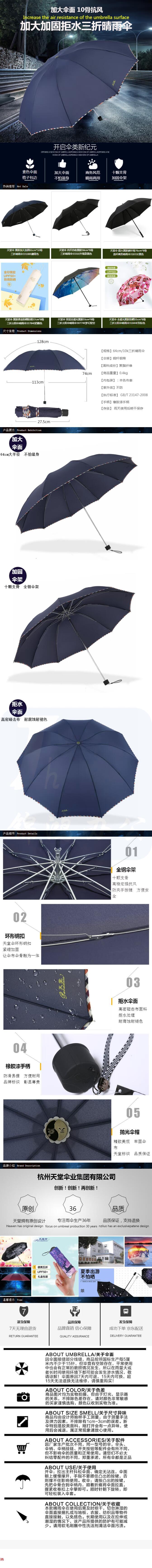 天堂伞 加大加固64cm*10骨三折晴雨商务伞3311E碰 藏青色