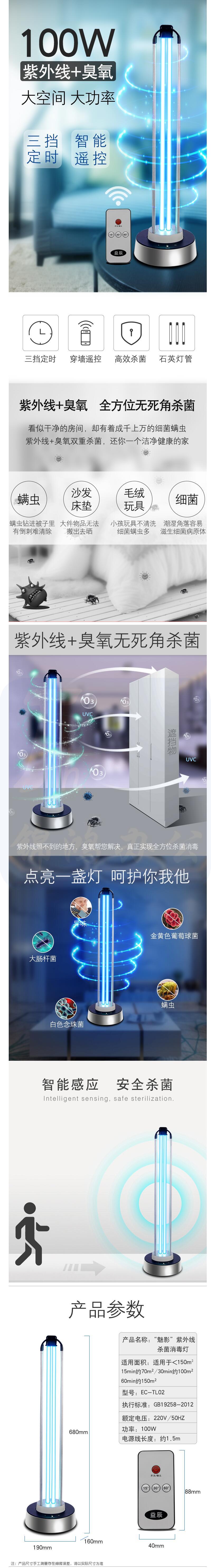 益辰 100W紫外线杀菌灯人体感应消毒灯家用