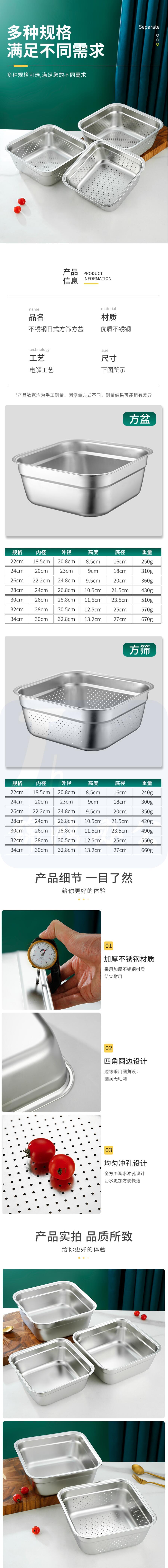 不锈钢方筛 30cm 滤水盆304漏水盆平底沥水盆洗菜筐卤菜盘漏油盆