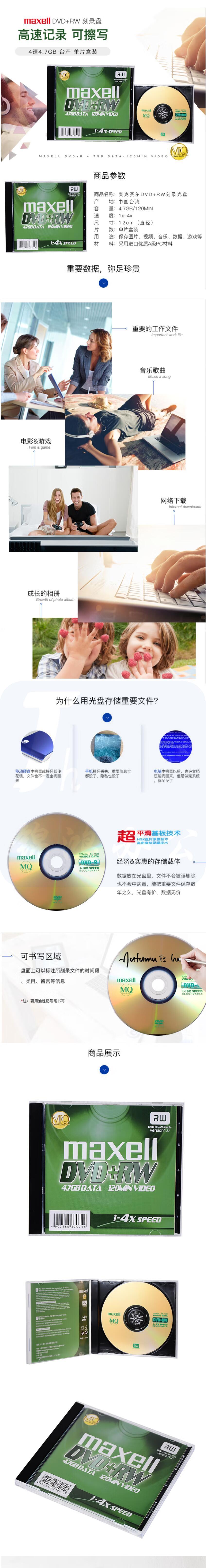 麦克赛尔 DVD+RW光盘 可擦写空白光盘 刻录光盘 光碟 4速4.7G台产 1片盒装