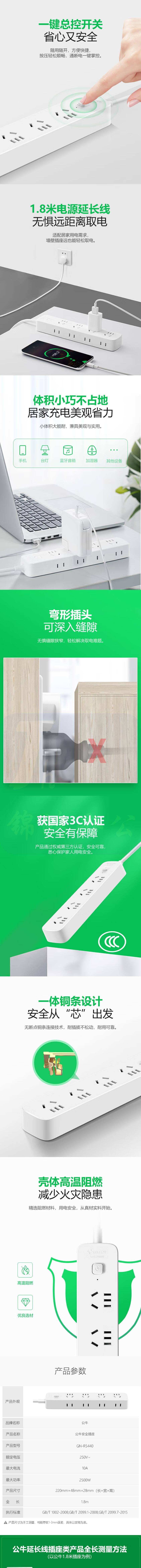 公牛 GN-R5440 8位总控1.8米 新国标插座/插线板/插排/排插/接线板/拖线板