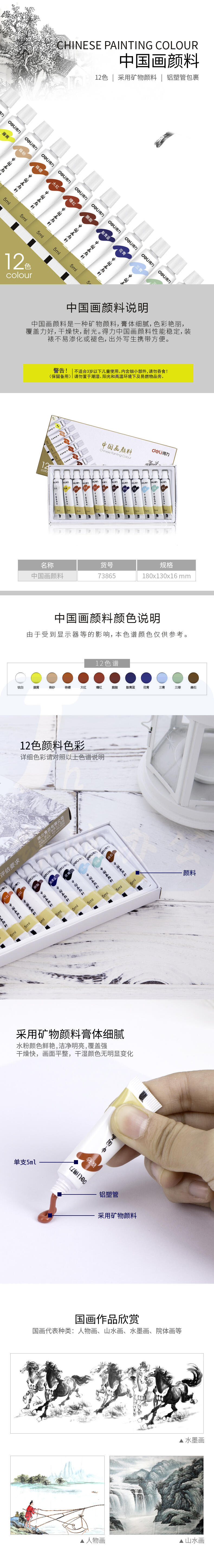 得力73865-12色5ml国画颜料学生绘画中国画颜料 画具画材(混)