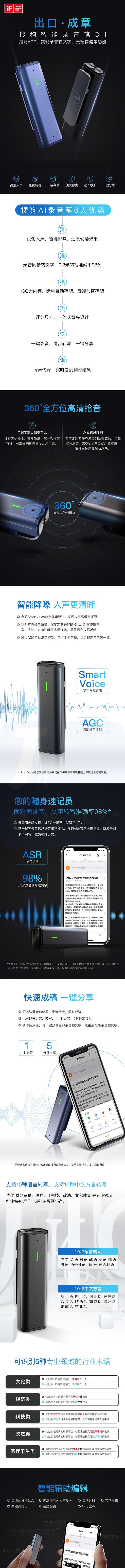 搜狗 录音笔C1智能AI录音转文字会议录音转写 16G